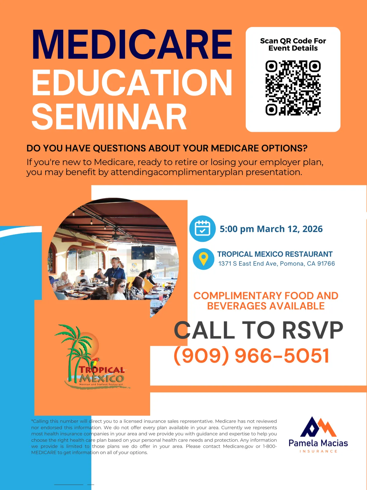 The Medicare Education Seminars are educational events only. No plan-specific benefits will be discussed, and no enrollment will take place.A complimentary meal will be provided to registered attendees. Any information presented will be educational in nature and not plan-specific.Calling the phone number listed will connect you with a licensed insurance agent. Submitting your contact information (including via QR code) authorizes a licensed insurance agent with Pamela Macias Insurance Services (Lic #4021753) to contact you to provide general Medicare information. Providing your contact information is optional and not required to attend the educational event. For accommodation of persons with special needs, call (909)966-5051. RSVP is required to attend due to limited seating. For information on all Medicare options, visit Medicare.gov or call 1-800-MEDICARE.